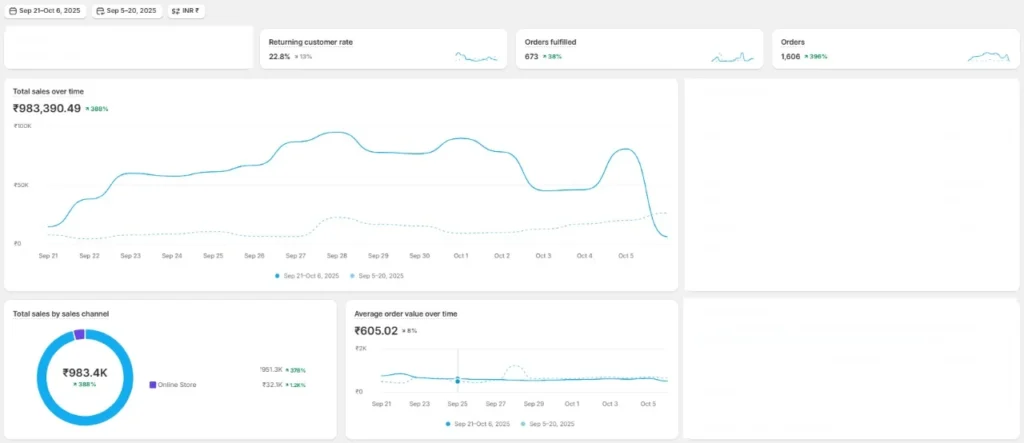 FMCG Hydration Brand: 16 days • ₹9.62L Net sales • 1,606 orders • AOV ₹605 • Returning 22.8% • +382% net vs prior period