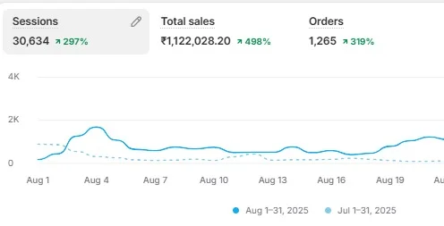 FMCG Snacks Brand (India) — 31 days • ₹11,22,028 total sales • 1,265 orders • AOV ₹887 • +498% sales vs prior • +297% sessions • +319% orders