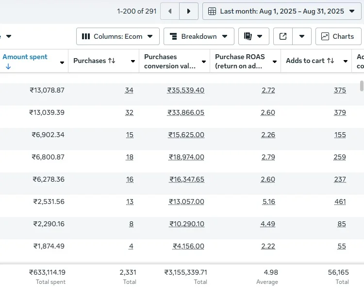 Fashion Brand (India) — 31 days • ₹42,33,340 tracked revenue (₹31,55,340 Meta + ₹10,78,000 SEO) • 4.98× ROAS on Meta • 2,331 purchases • AOV ₹1,354 • MER 6.69×