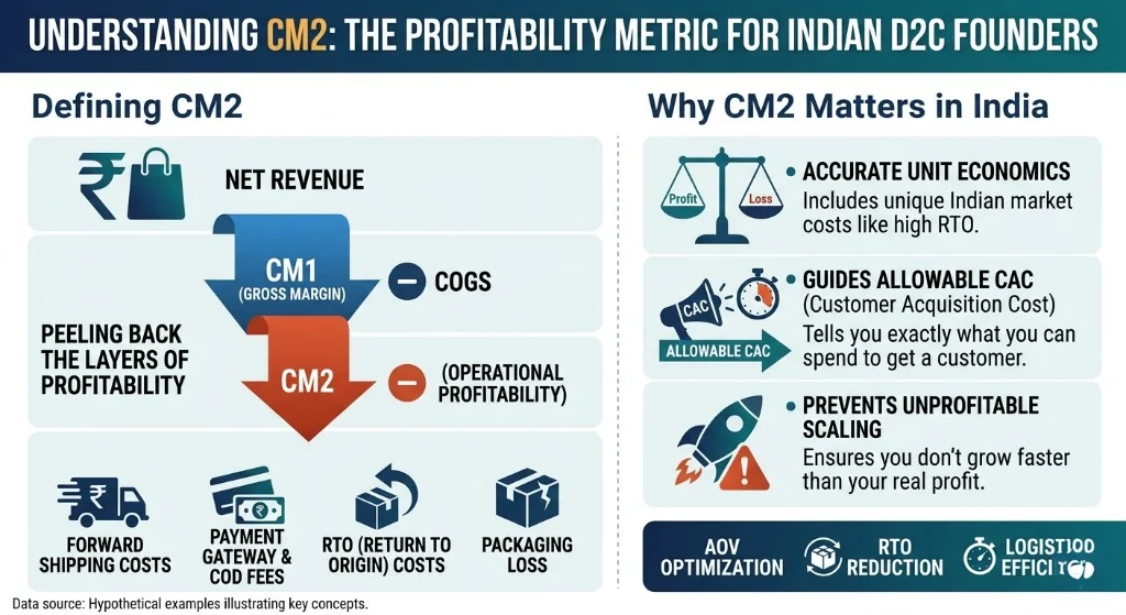 A healthy CM2 is 10-15% of AOV for most Indian D2C categories. Above 15% is excellent. Below 5% means you need to optimize urgently. Negative CM2 means you are losing money on every customer acquired through paid channels.