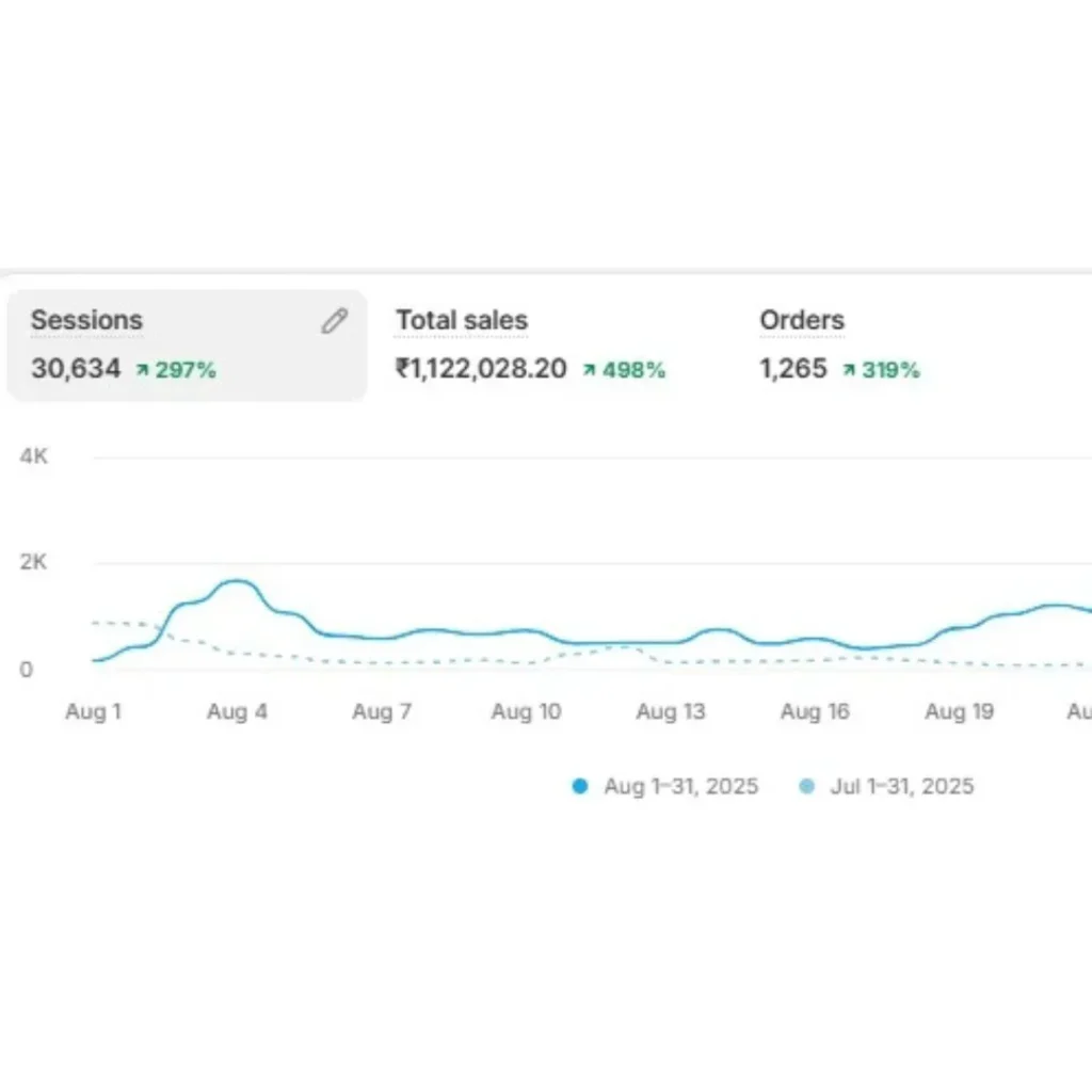 FMCG Snacks Brand (India) — 31 days • ₹11,22,028 total sales • 1,265 orders • AOV ₹887 • +498% sales vs prior • +297% sessions • +319% orders